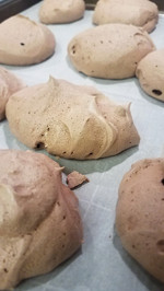 Beat in the tsp of vanilla extract and now for the fun personalization part. If you do not wish to use chocolate that is ok. You can leave it plain or add a different extract, freeze dried raspberries, gel food coloring, the sky's the limit. Since I doubled the recipe, I put half of the mixture into the other mixing bowl and beat in 1/4 c of a good dutch processed cocoa powder. You could fold it in but I have no problem using a whisk to mix it in. To the other bowl I took the melted chocolate ( I used a mixture of 62% and 70% semisweet and bittersweet half of each bar) and drizzled it across the top of the meringue in the bowl and the used a spoon to take dollop sizes out while keeping the swirl Do not mix in the melted chocolate. You want a contrast if you are following along.